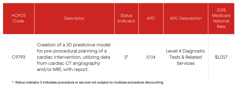 Originally effective January 1, 2024, HCPCS code C9793 describes the creation of a 3D predictive model for pre-procedural planning of a cardiac intervention, using data from cardiac CT angiography (CTA). As of April 1, 2025, CMS revised the code descriptor to include cardiac magnetic resonance imaging (CMR) as an eligible imaging modality under the Medicare Outpatient Prospective Payment System (OPPS).